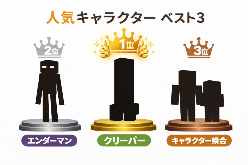 第一位は「クリーパー」です。マイクラを象徴するキャラクターで、シンプルながらインパクトがあり、小学生から圧倒的な支持を集めています。